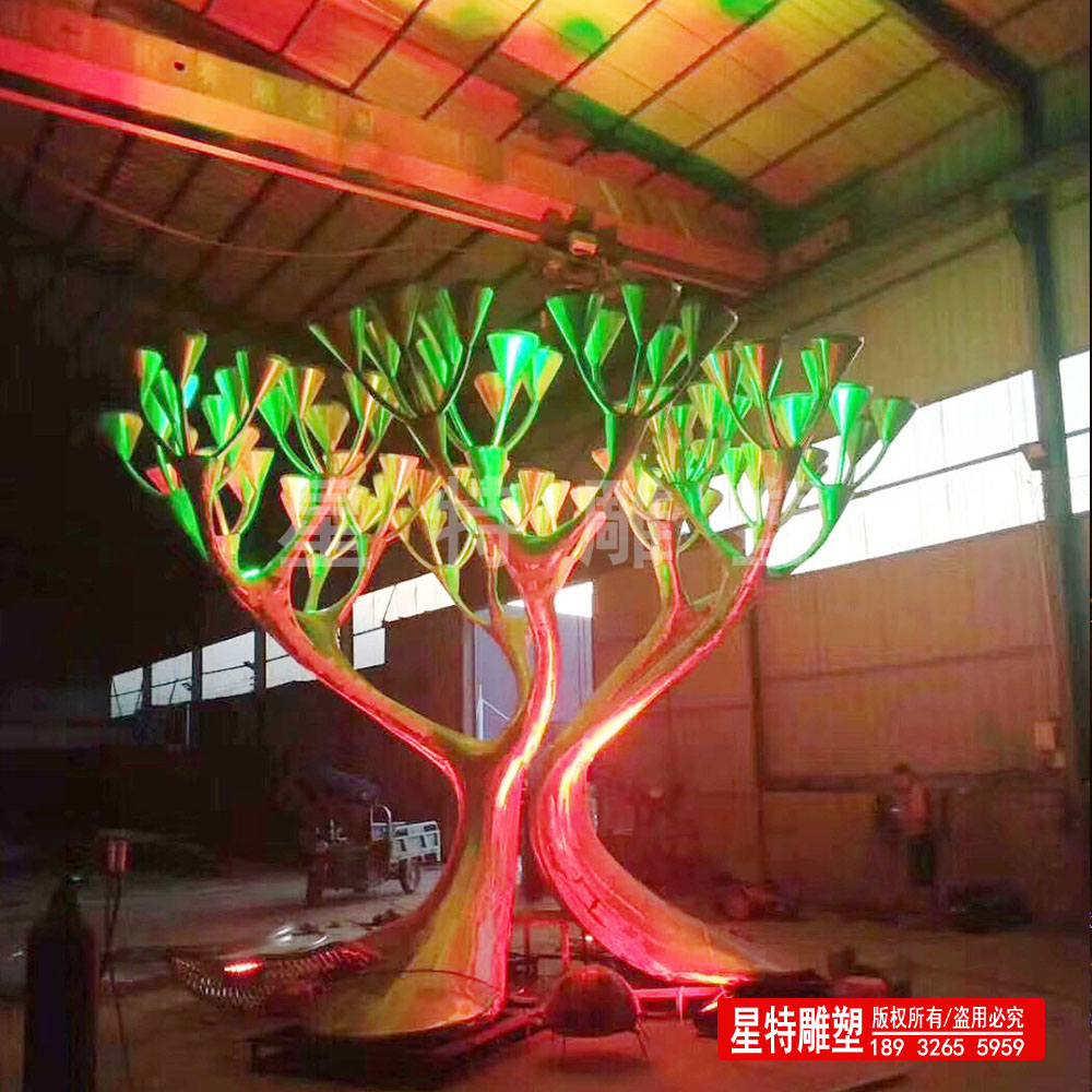 “彩色不銹鋼雕塑所使用的材質它是在銀白色的不銹鋼表面形成一層透明的氧化膜,通過該氧化膜對光的干涉作用而形成不同的色彩。也可以通過噴漆的形式來展現雕塑的色彩。