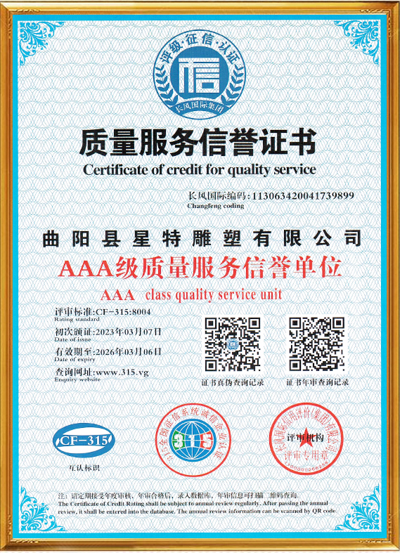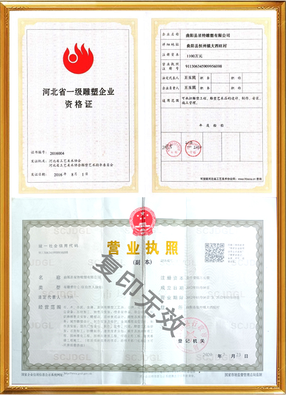 曲陽縣星特雕塑有限公司成立于2008年,總部位于具有千年雕刻文脈、擁有“中國雕刻之鄉”美譽的河北省曲陽縣,是一家集創意設計、雕塑生產、雕塑藝術創作、景觀環境藝術為一體的雕塑公司。在十幾年的時間里,我們從蹣跚起步,再到砥礪前行,始終持初心、踐匠行,為弘揚曲陽雕塑文化做出自己應做的貢獻。目前,我公司與中央美術學院、清華大學美術學院、西安美術學院等全國知名美院機構保持長期的交流與學習,并與多個國家雕塑、美學專家老師合作、溝通、共享雕塑帶來的無國界藝術享受。成功設計并制作了數百個城市雕塑作品,受到了當地政府、主管領導及客戶的表彰和贊譽。公司已通過(ISO9001)國家質量體系認證,將繼續秉承誠信、自律、求智、進取的企業精神,和崇尚榮譽、捍衛責任、創造價值的企業核心價值觀,弘揚中華藝術,振興民族產業,發展星特企業,用事實說話,用作品見證,力爭打造一個生命力強勁的民族雕塑企業向著國際化現代企業集團邁進,為曲陽雕塑文化的發揚做出重要貢獻。